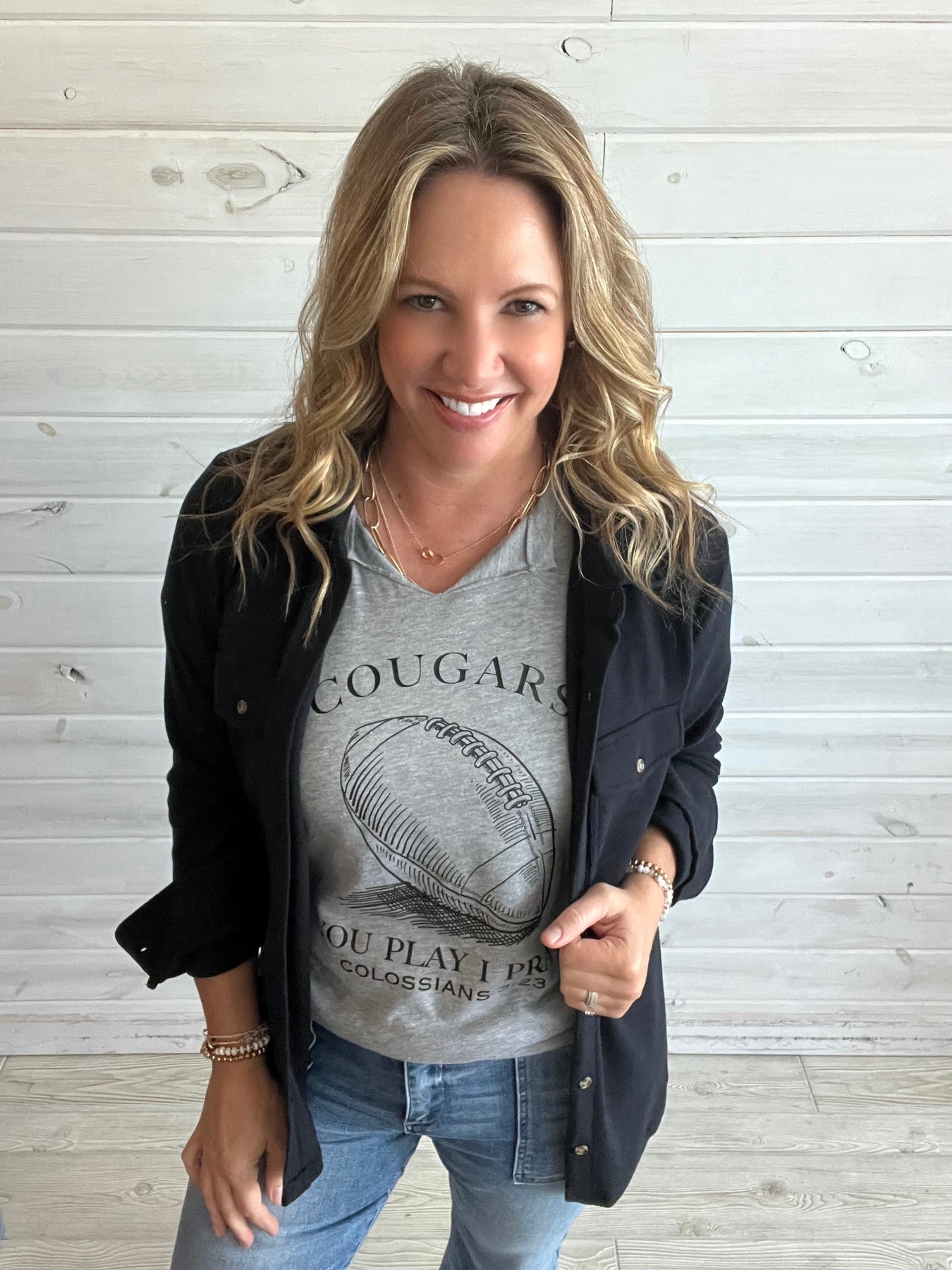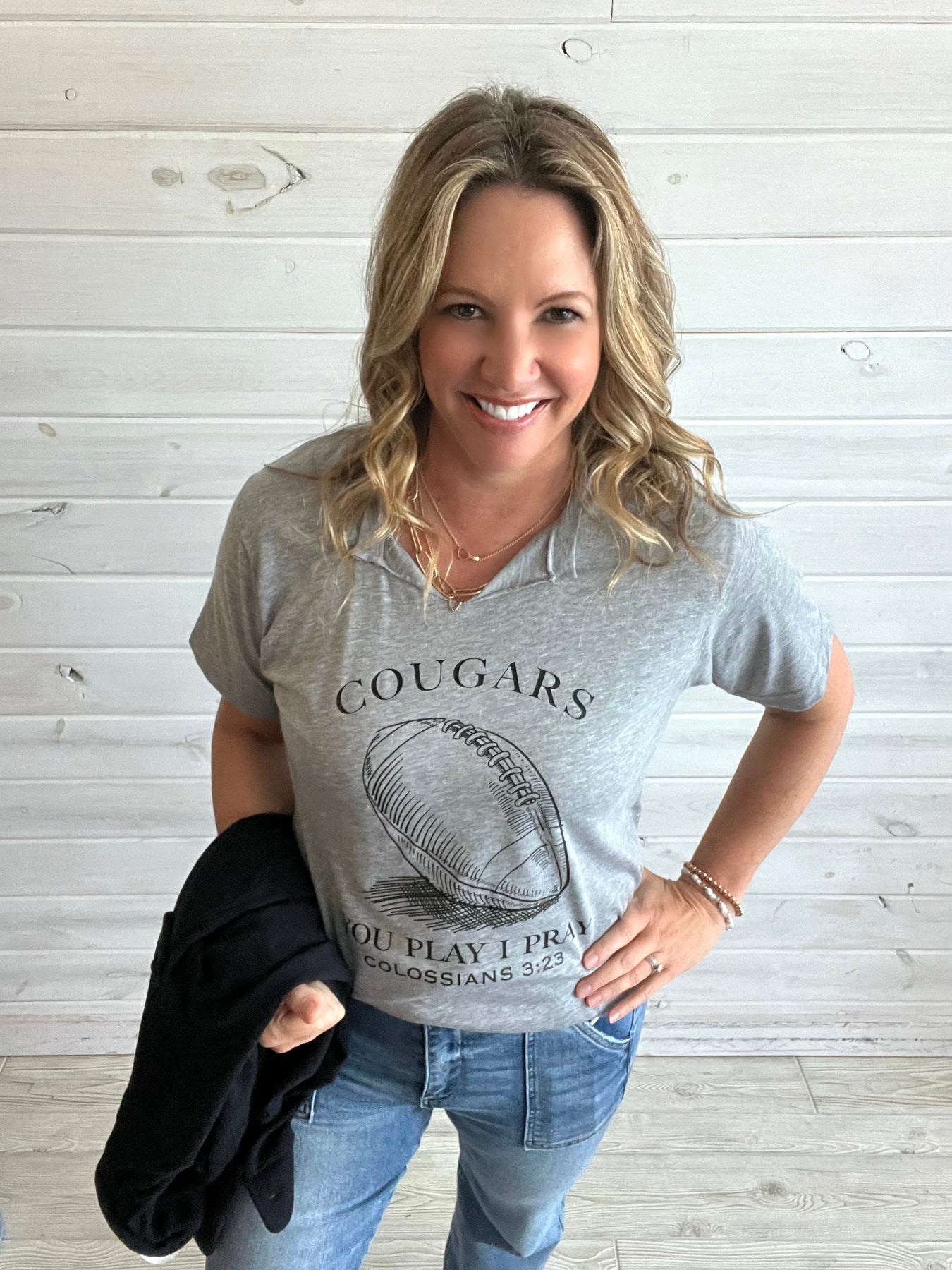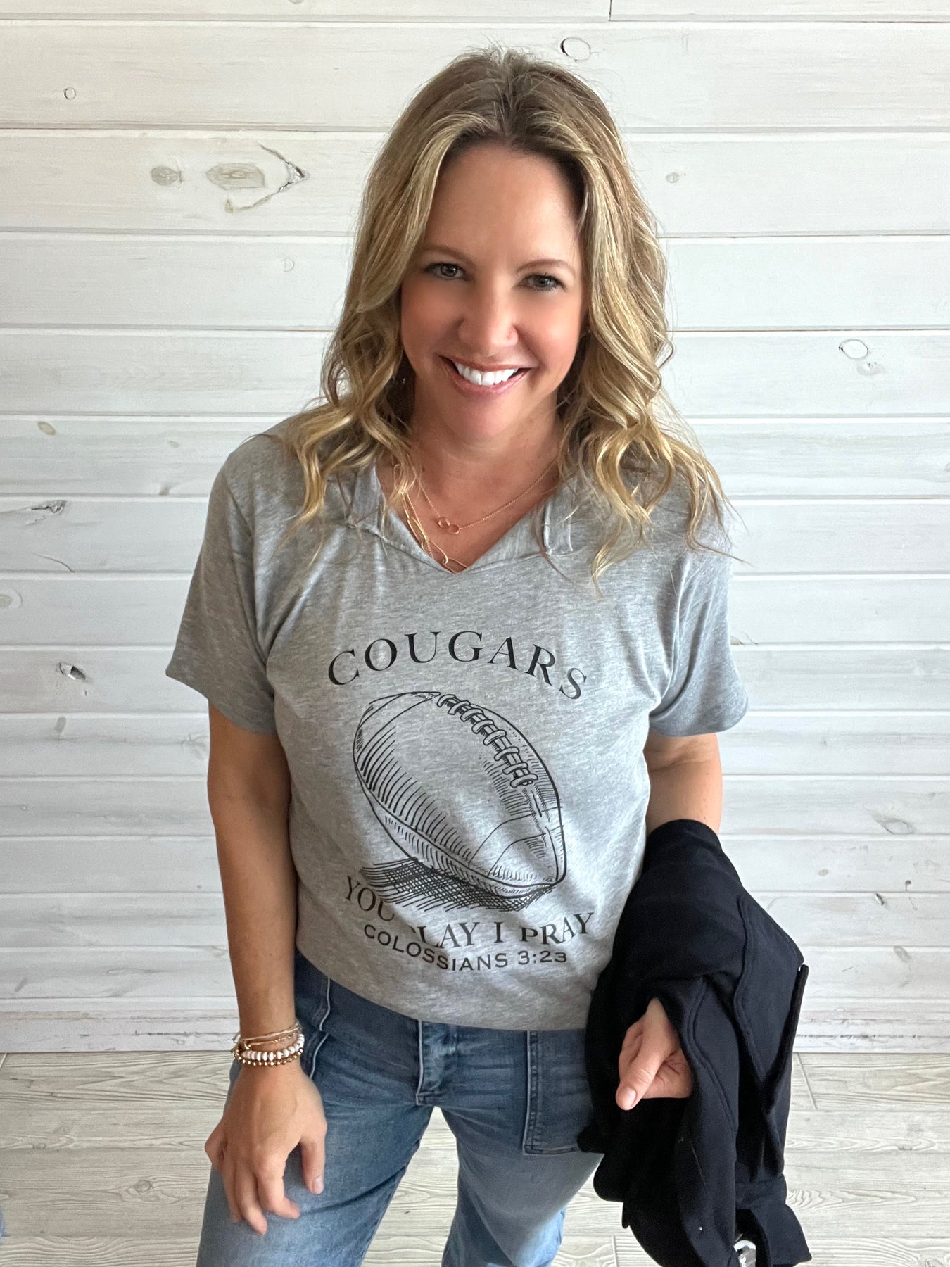 65% Polyester, 35% Cotton. Wash on cold, lay flat or hang to dry. Edges of V-neck are sewn down to the shirt.
