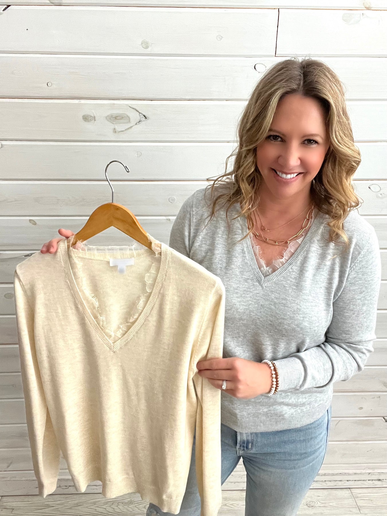 {"id":51768802345254,"title":"Gray \/ XS","option1":"Gray","option2":"XS","option3":null,"sku":null,"requires_shipping":true,"taxable":false,"featured_image":null,"available":true,"name":"Lace Trim V-neck Sweater (2 Colors) - Gray \/ XS","public_title":"Gray \/ XS","options":["Gray","XS"],"price":6500,"weight":340,"compare_at_price":null,"inventory_quantity":1,"inventory_management":"shopify","inventory_policy":"deny","barcode":"02345254","requires_selling_plan":false,"selling_plan_allocations":[]}